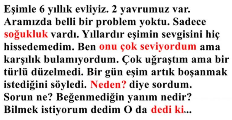 Isınamıyorum bir türlü” Tamam dedim ve o gün boşanmaya karar verdik. Sonra düşününce bunun ş-eytandan olabileceği aklıma geldi. Allah Rasulü (Sallallâhu aleyhi ve sellem) Bakara suresi okunan eve ş-eytanın giremeyeceğini haber vermişti. ‘Evlerinizi kabirlere çevirmeyiniz! Muhakkak ş-eytan, içinde Bakara Suresi okunan evden kaçar!’ Müslim 780/212, Tirmizi 3036